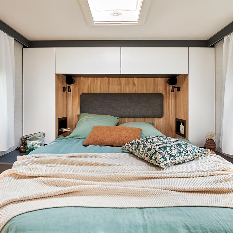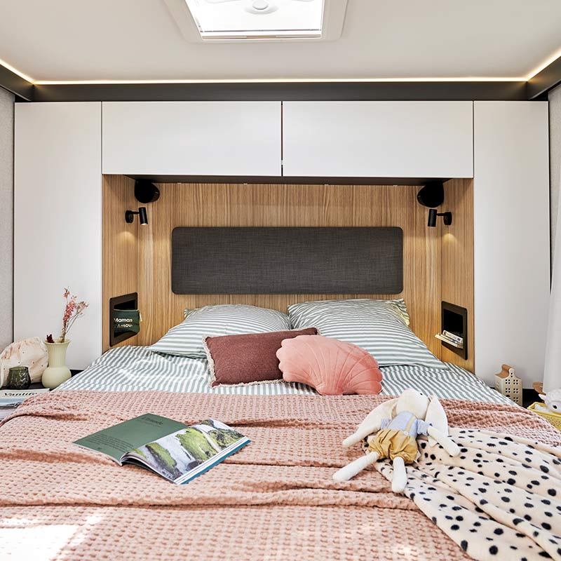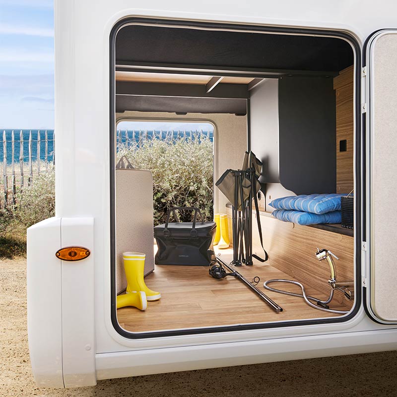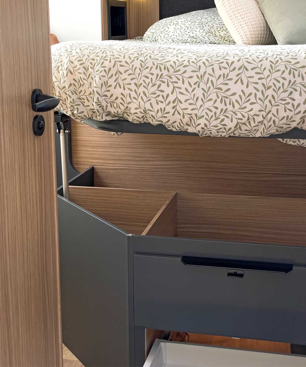 - Une soute réglable en hauteur électriquement sous le lit central (uniquement sur le modèle G720FC) pour gagner encore plus de volume de rangement.
