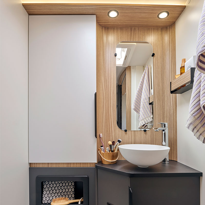- Un chauffage hybride Combi D6 E TRUMA® 6 000 W fonctionnant au diesel et à l’électricité (230 V), pour une montée en température plus rapide et une plus grande autonomie que le gaz.