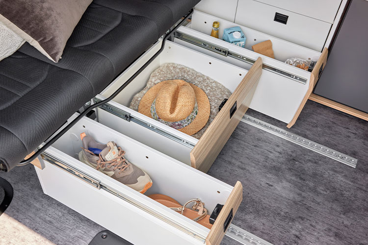 Voyagez en toute sérénité grâce au double panneau solaire extra-plat 2x100W à haut rendement, au chauffage au gazole 2000W avec kit d’altitude et soufflerie variable, à la batterie auxiliaire AGM et au système d’eau chaude grande capacité fonctionnant au gaz ou à l’électricité (230V). Enfin, profitez d’un réfrigérateur à compression de 51L.
